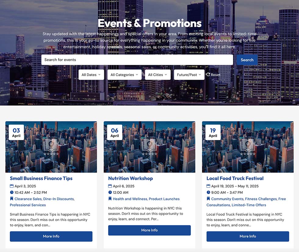 The Events & Promotions page is designed to keep users informed about local happenings, special offers, and unmissable gatherings. Here’s how the page is structured: